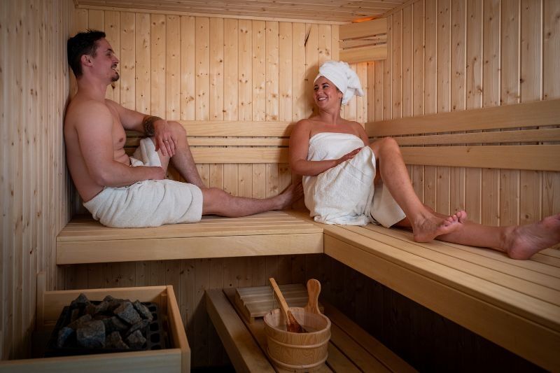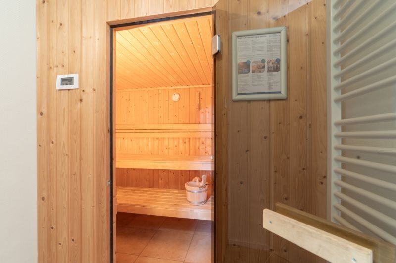 Wellnessbereich mit 10-Personen-finnischer Sauna, separater Dusche mit Sonnendusche und WC.