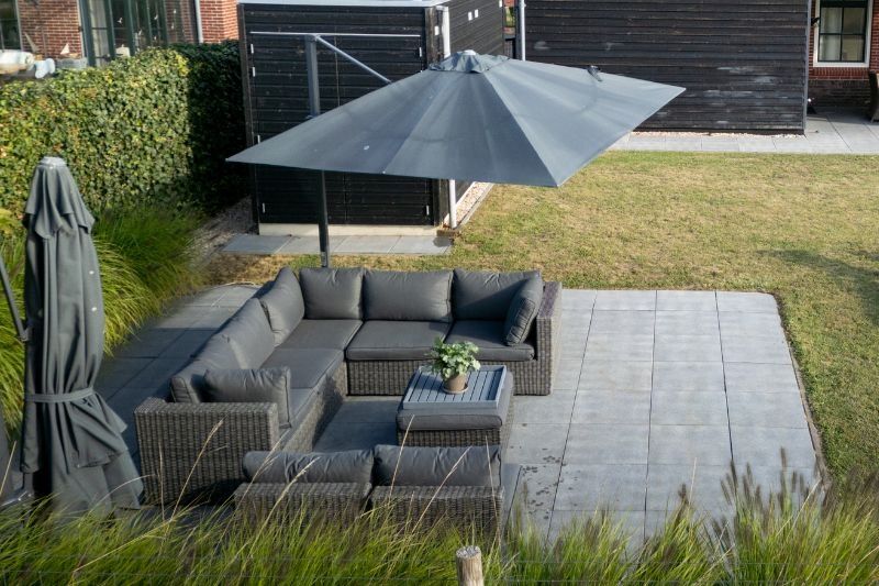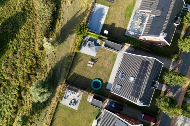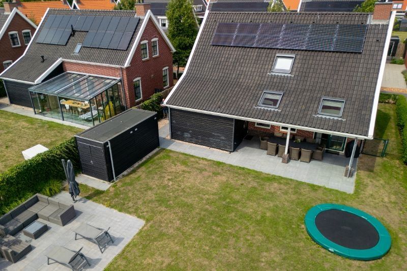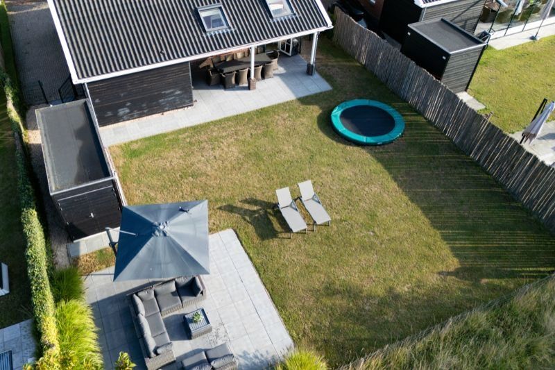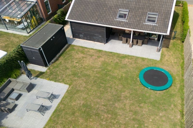 Großer, vollständig umzäunter Garten mit Rasenfläche und Bepflanzung. Der Garten verfügt über ein großes Trampolin und eine Sonnenterrasse im hinteren Bereich. 2 Parkplätze vor dem Haus.